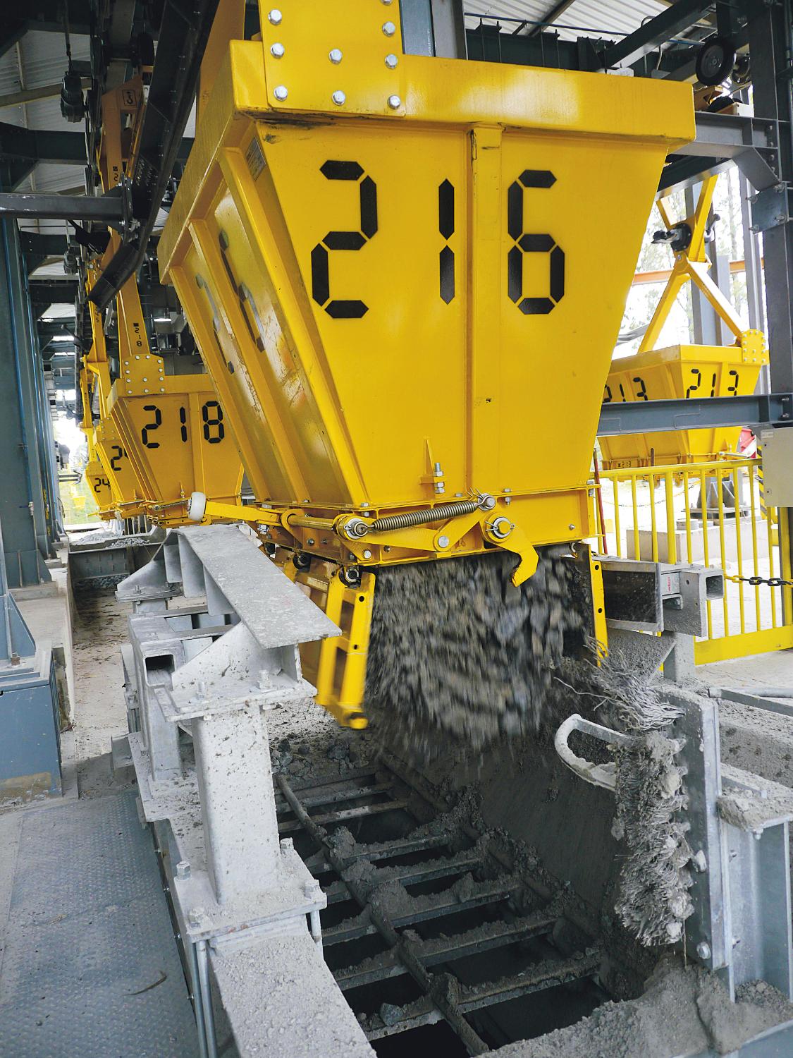 The shape of the bucket and the unloading of the material depend on the characteristics of the material itself. The material can be unloaded through the bottom of the bucket or by tipping the entire bucket; after unloading, a bucket cleaning system can be provided, as well as a storage and washing system.