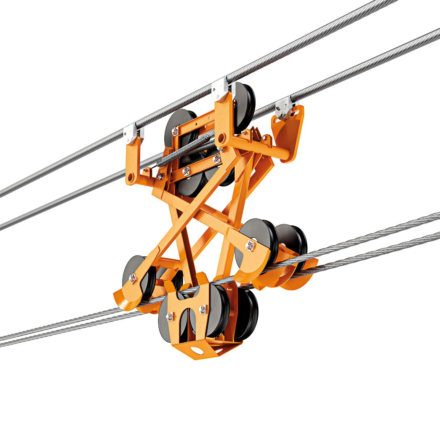 I Blondin Agudio sono gli unici sul mercato ad arrivare a velocità di lavoro così elevate (8 m/s in traslazione e 4 m/s in sollevamento), grazie a cavallotti brevettati che mantengono le funi sempre nella posizione corretta.
