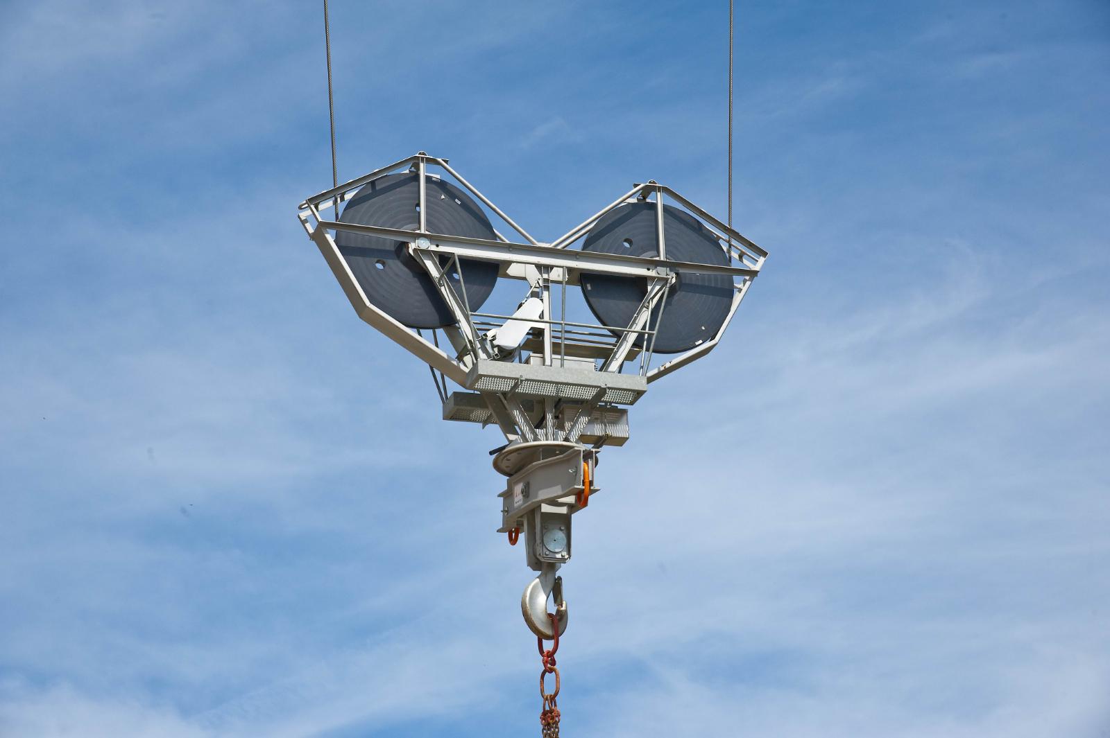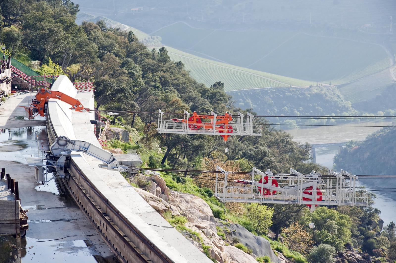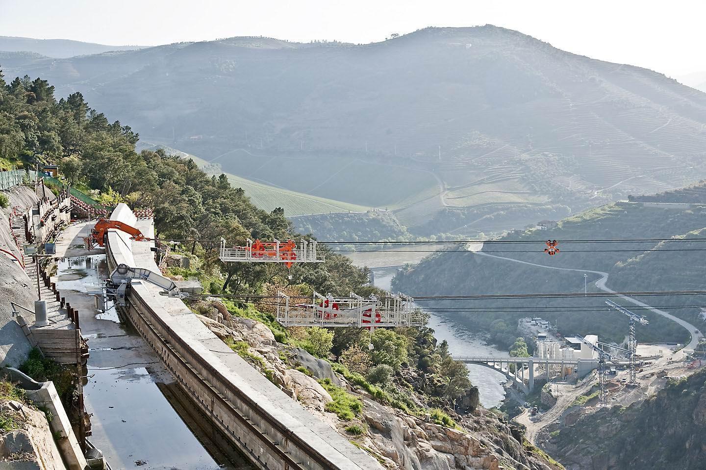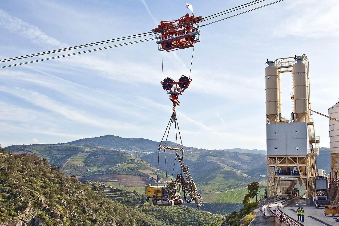Due blondin radiali da 28 ton utilizzati per il trasporto del calcestruzzo e per il sollevamento e posizionamento delle apparecchiature di cantiere.