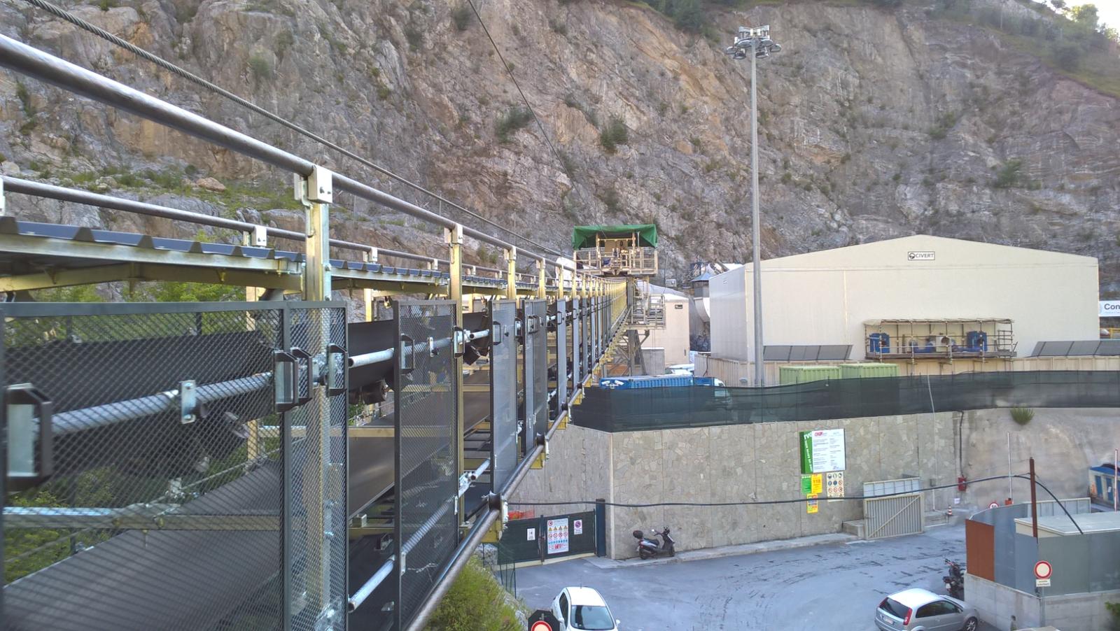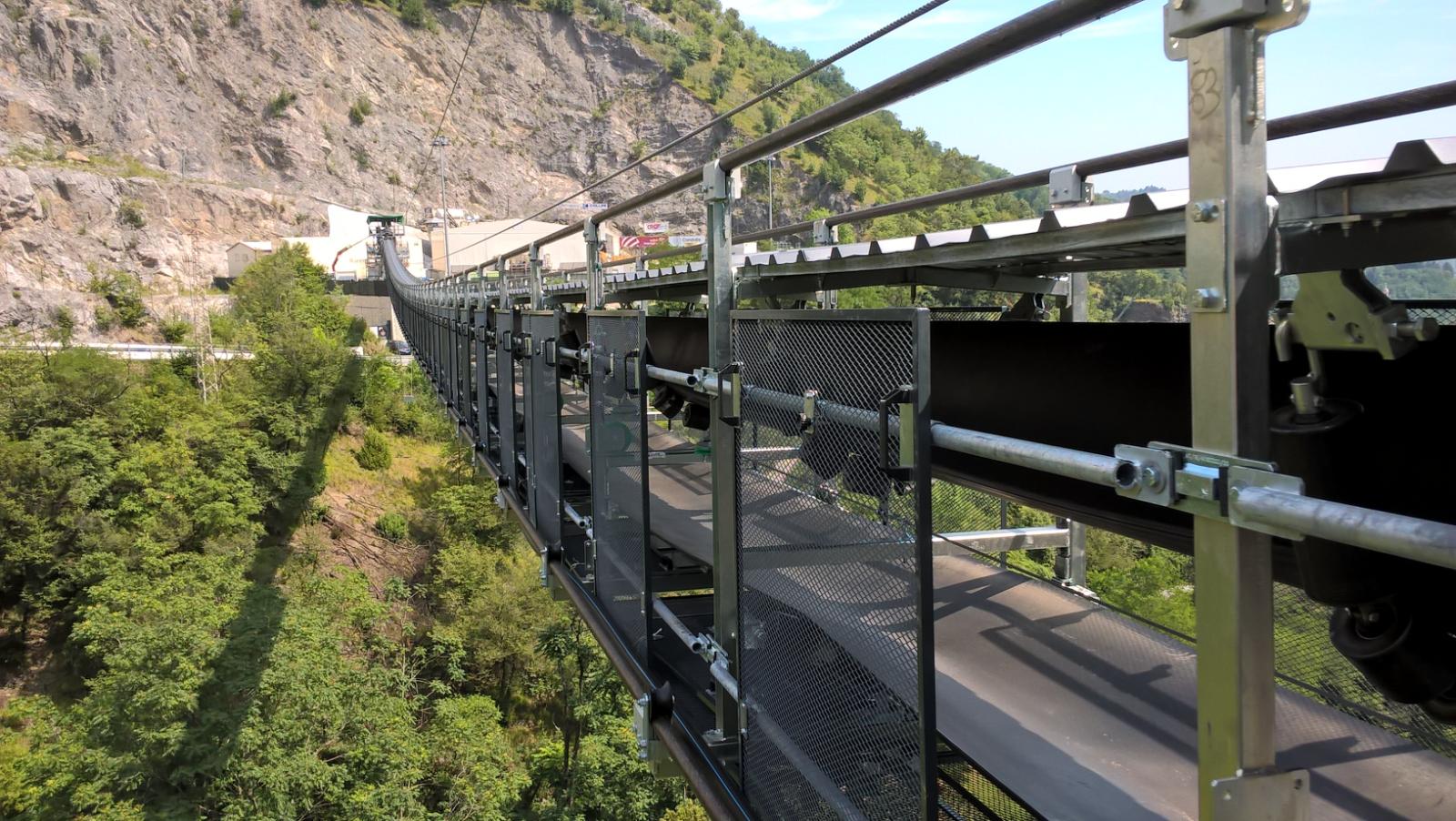 Flyingbelt in funzione in uno dei cantieri del Terzo Valico dei Giovi, viene utilizzato per trasportare lo smarino dalla bocca del tunnel alla zona di stoccaggio attraversando una valle di circa 300 metri senza necessità di strutture metalliche di supporto. La tecnologia Flyingbelt è stata scelta dal Cliente per la sua semplicità e il basso impatto ambientale.
