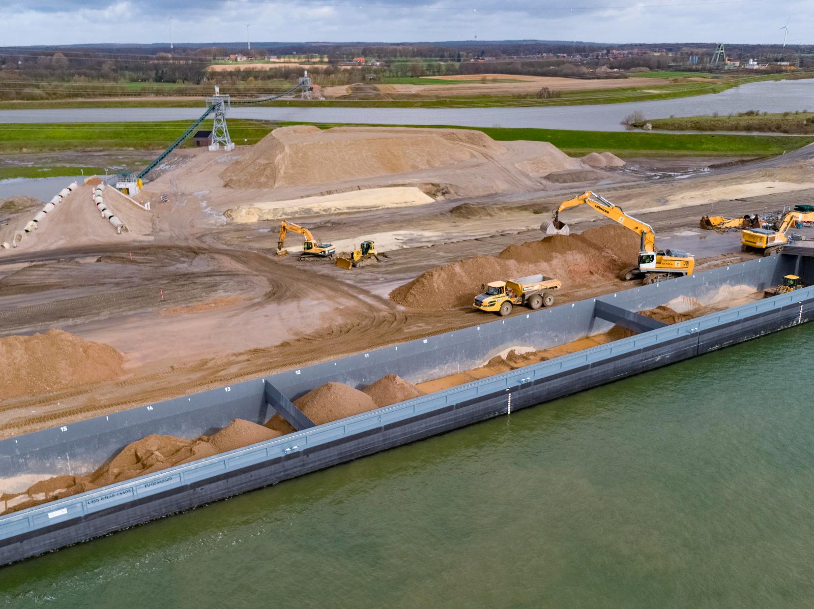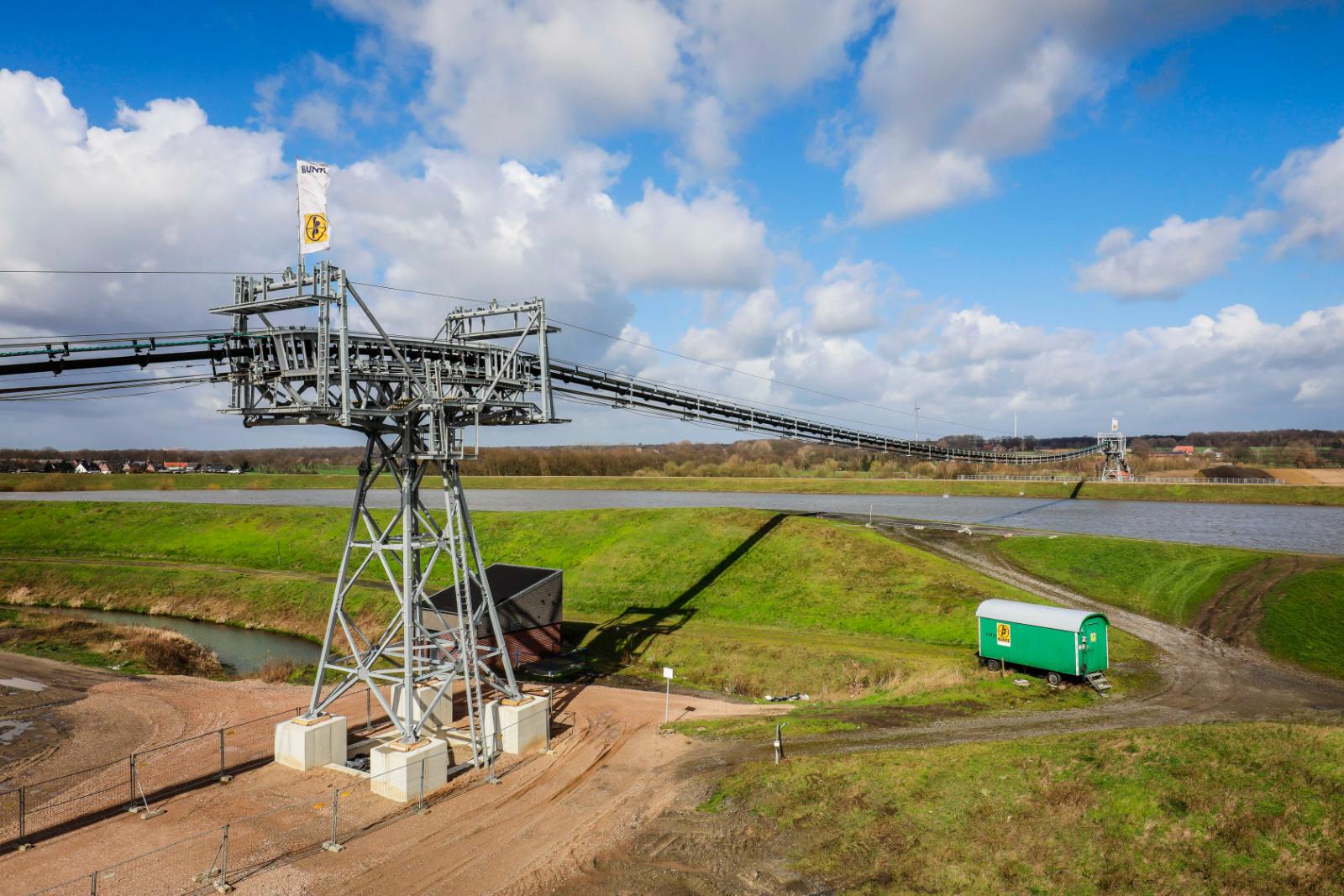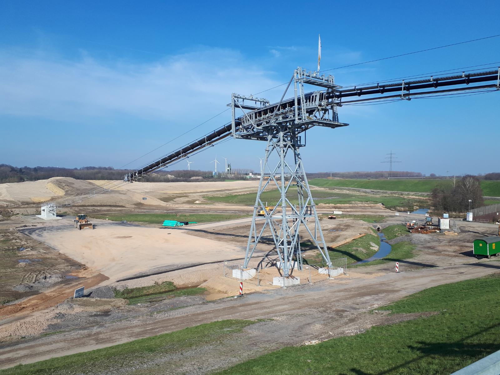 Flyingbelt utilizzato per trasportare aggregati alla riva Nord del fiume Lippe sorvolando direttamente il fiume e accorciando la distanza di trasporto da 7 km a soli 500 metri, evitando un impatto notevole sul traffico locale.